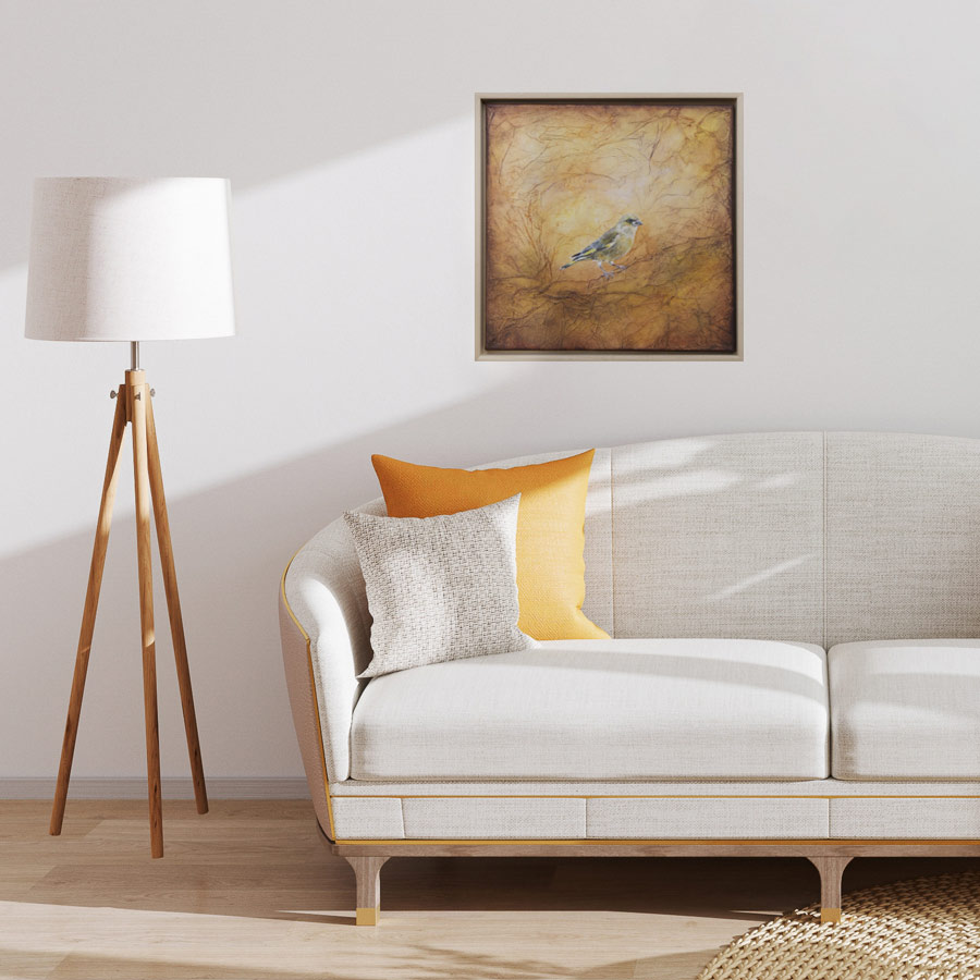 Barevné ladění ptáčka i pozadí je podobné jako u obrazu Králíček obecný, hodí se tedy do dvojice k sobě.